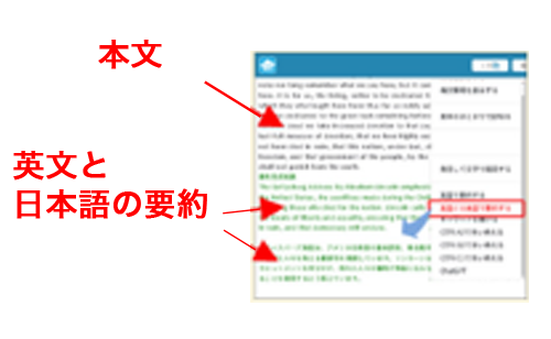 英⽂を⽇本語と英⽂、あるいは英⽂だけで要約し、⽂章の概要を把握することができます。第⼆外国語にも対応しています。
